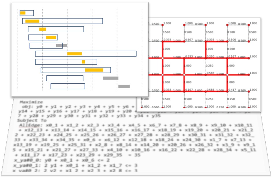 数理最適化、オペレーションズ・リサーチ:経営的意思決定支援を科学的にアプローチするオペレーションズ・リサーチ、またその中でも特に、与えられた制約条件の下で最適な解を求める数理最適化の研究を行っています。テーマとしては以下の通りです。