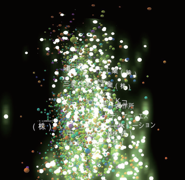 自動車産業の一部に起きた経済ストレスが他の企業に伝搬していく様子を、スパコン「京」で計算して動画として可視化した。光っているところが強い経済ストレスを受けた企業を示している。各点の大きさは企業規模、色は業種、影響を共通して受けやすい企業群がより近い場所に配置されている。(理化学研究所、株式会社ターンストーンリサーチ、デジタルハリウッド大学院の協力による)