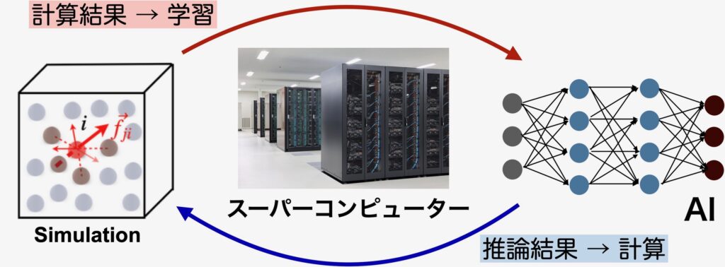 私は現在、分子シミュレーションの結果として得られるデータに対して深層学習を実施し、その学習モデルの予測性能を利用してシミュレーションそのものを効率化できる循環を実現する手法の研究開発を進めています。実は、このような研究を行うには、シミュレーションしようとしているモデルの特性をよく理解し、それに適したアルゴリズムを開発していくこと、そして深層学習を得意とするGPUなどの演算装置の利用に習熟することが重要となります。