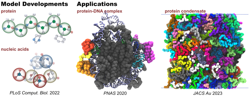 I develop coarse-grained models for biomolecules and apply multi-scale molecular dynamics simulations to investigate the interactions between protein and nucleic acids. With the implementation of various models in the software GENESIS and the execution of simulations on supercomputers like Fugaku, we gain exciting results on large-scale behaviors of biomolecular systems, such as liquid-liquid phase separation