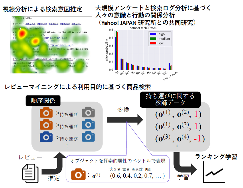 ウェブ検索をはじめとした情報アクセスに関する研究を行っています。「情報を探す」という行為は我々にとって欠かせない行為です。その行為について深く知り、そしてより良いものとするための技術について、インタラクション技術、アルゴリズム、ユーザ調査といった多様なアプローチから取り組んでいます。