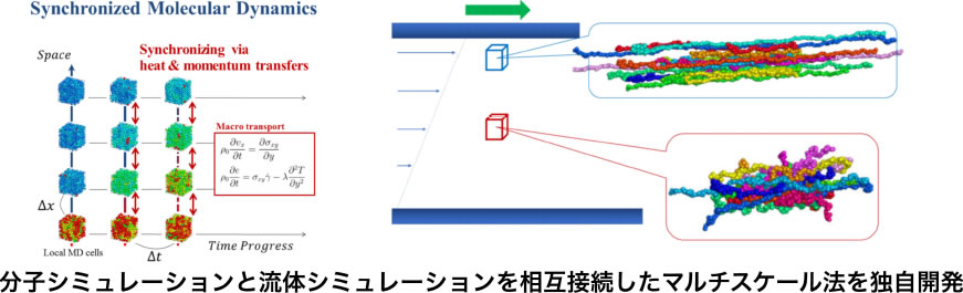 特に、分子シミュレーションと流体シミュレーションを相互に接続するマルチスケールシミュレーションの開発や、微視的(粒子的)な数理モデルと巨視的(連続体的)な数理モデルに対して、その両者を繋ぐ中間的な視点による運動論モデルについての研究を行っています。